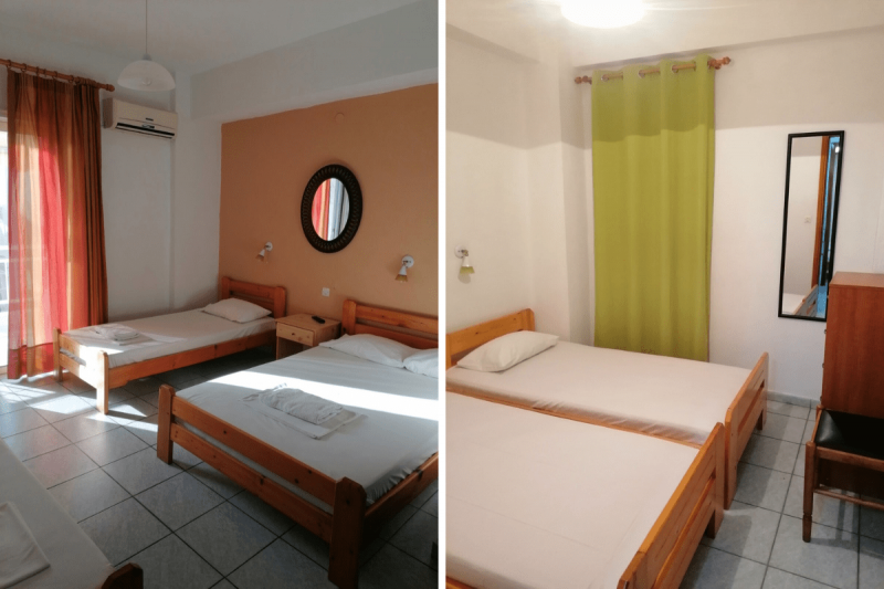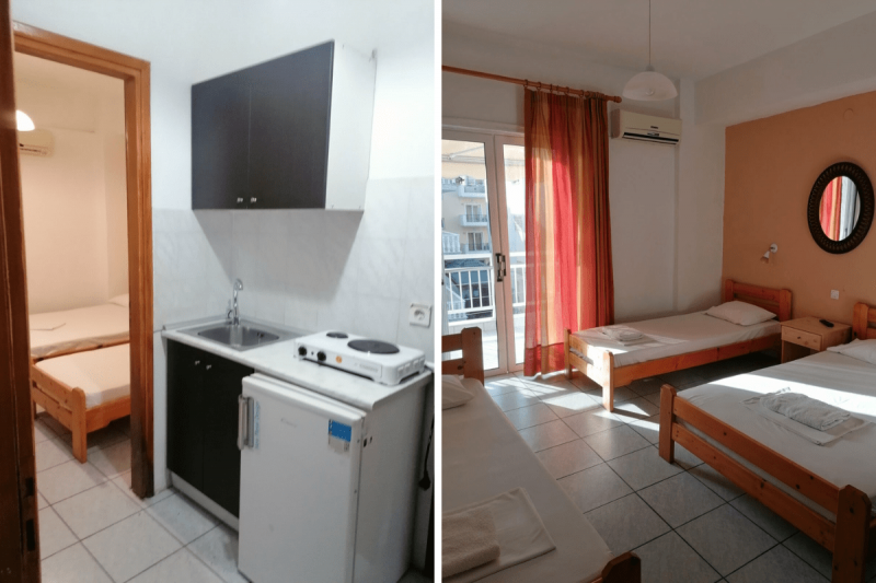 Vila Dimitris nalazi se na 150 m od plaže u centralnom delu Olympic Beach-a. Vila raspolaže dvokrevetnim i trokrevetnim studijima, četvorokrevetnim i petokrevetnim duplexima. Studiji su lepo opremljeni, poseduju čajnu kuhinju, kupatilo, TV i A/C. Klima uređaj se dodatno doplaćuje na licu mesta (7-10€ po danu).