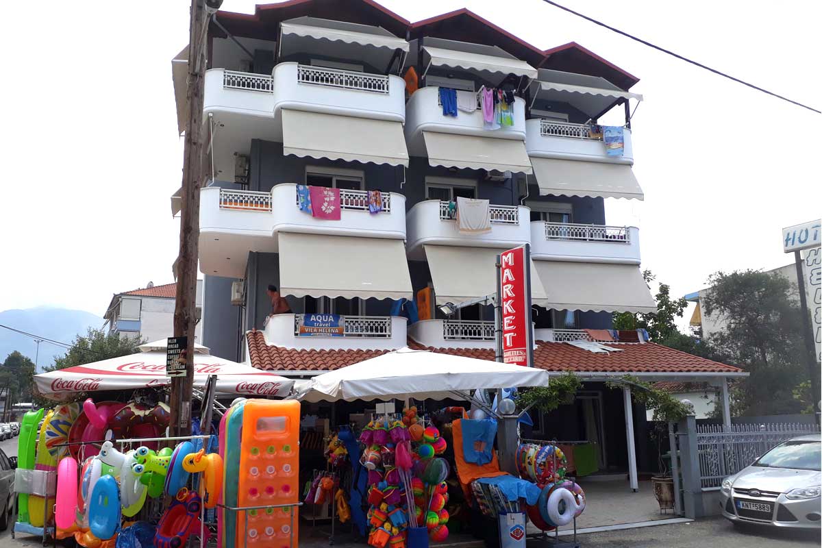 Njena zapadna strana gleda na prelepe obronke planine Olimp. Vila Helena ima 18 soba koje su raspoređene u prizemlju, na prvom, drugom i trećem spratu. Svaka je opremljena kuhinjom sa frižidrom, kupatilom sa TWC-om, klima uređajem kao i TV-om. Klima uređaj se dodatno doplaćuje na licu mesta (7-10€ po danu).